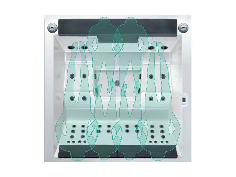 Le Lounge 4 est un spa au design moderne et intemporel. Son espace intérieur ergonomique comprend deux fauteuils de massage et quatre places assises, idéal pour partager un moment de détente en famille ou entre amis.